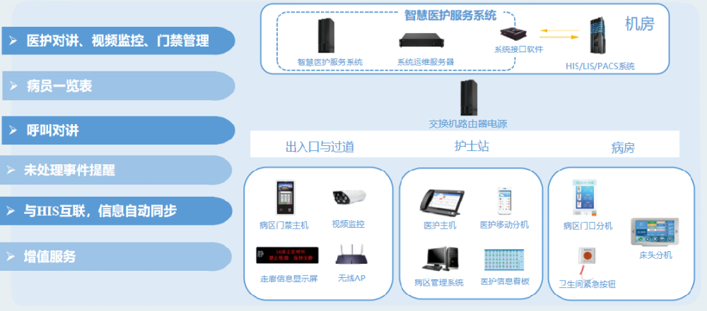 主要用于医院、护理院、养老院等单位,可实现患者、护士、医生之间的呼叫及双向高清可视对讲,保证病患与医护人员之间及时沟通。减少医患纠纷,提升医院服务质量,提高医院管理水平及医护工作效率。